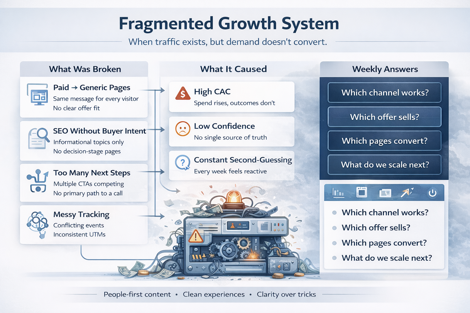 The business wasn’t failing because of one issue. It was failing because the entire growth system was fragmented. Paid traffic went to generic pages with weak positioning.
