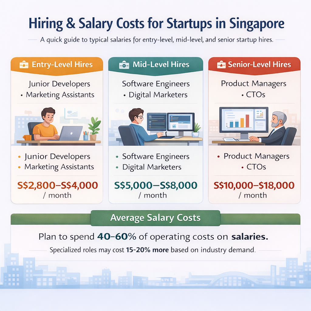 Salaries often account for 40–60% of startup expenses. Junior roles start at SGD 2,800–4,000 monthly, while mid-level professionals earn SGD 5,000–8,000.