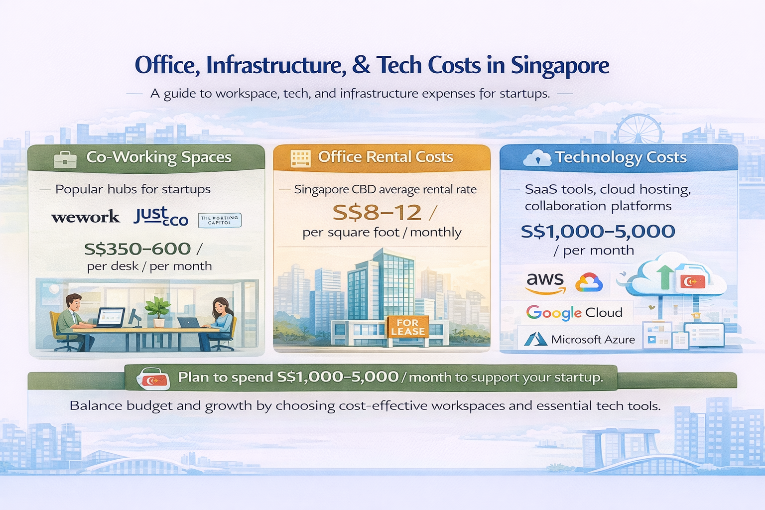 Co-working spaces cost SGD 200–700 monthly per desk, while private offices can exceed SGD 1,500. Many early-stage startups choose flexible memberships or remote-first setups.