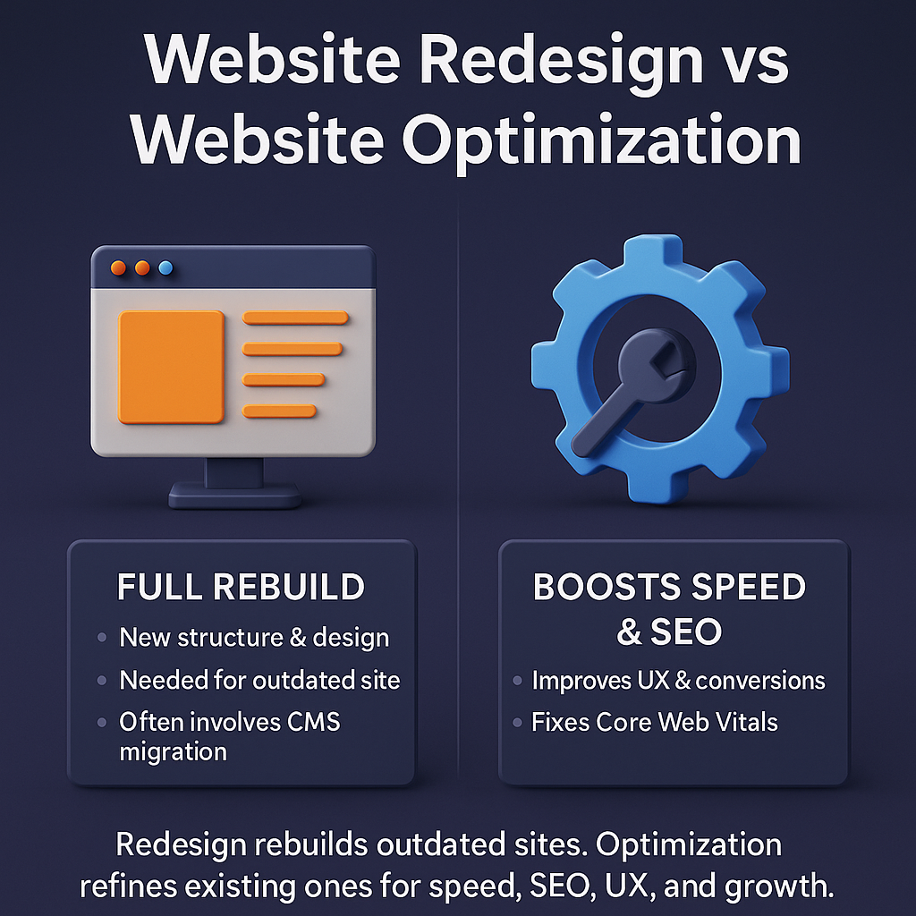 In short, redesign works best for outdated or broken websites. Optimization is ideal when design is fine but performance and visibility need improvement.